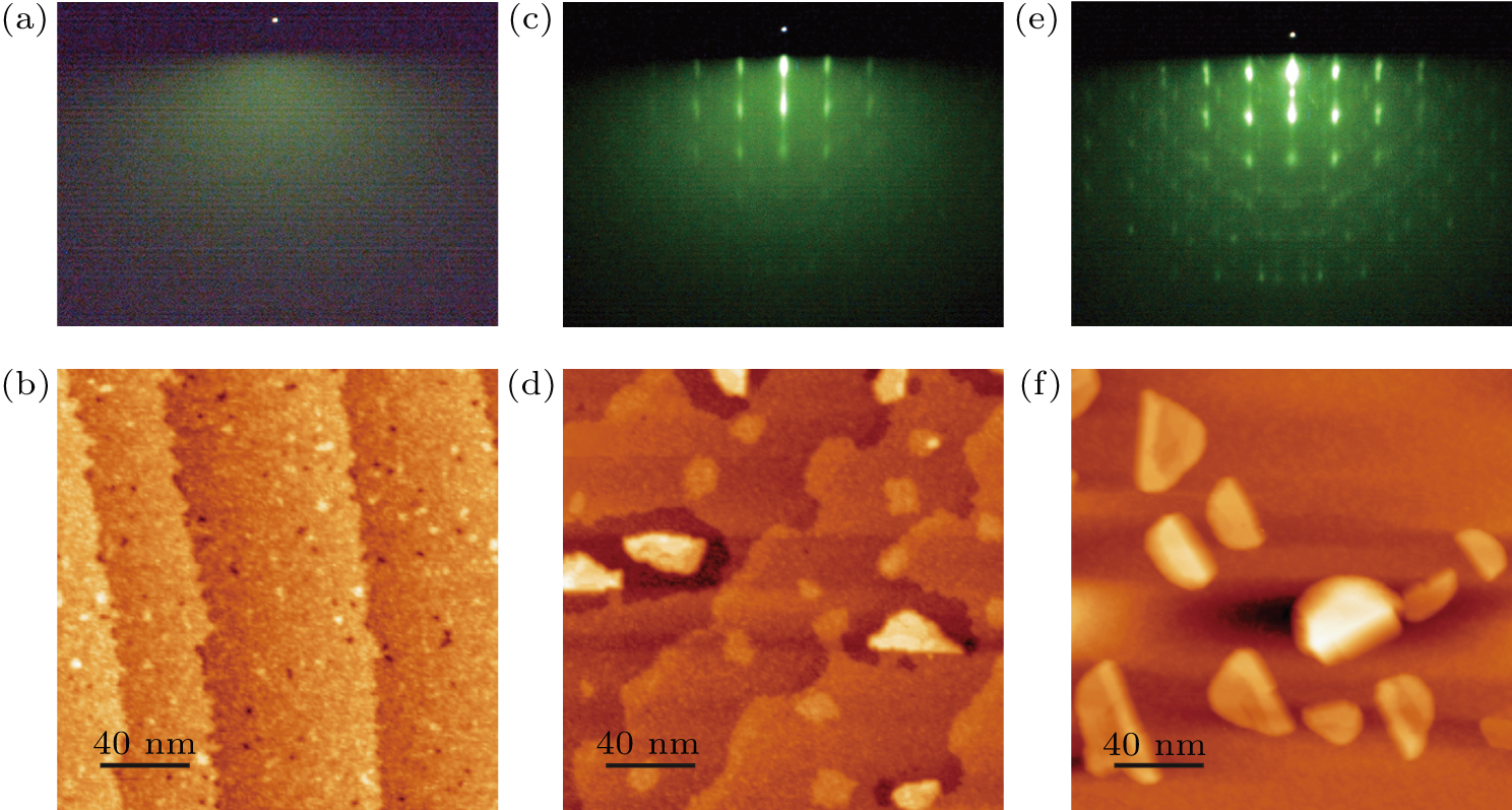 To obtain high-quality films, we use the (2 × 2) reconstructed surface of the STO (001) substrate, which is TiO2-terminated and can be obtained by the process described above. The presence of TiO2 (2 × 2) reconstructed surface can be confirmed by the atomically flat morphology as shown in the STM image of Fig. 1(a) as well as the sharp (2 × 2) RHEED pattern (insert). In a smaller scale, the high-resolution STM image and fast Fourier transform pattern (FFT) are shown in Fig. 1(b), similar to the results in the literature.[27] Figure 1(f) (upper one) shows the topographic profile along the dark blue line in Fig. 1(a) and gives the step-height of STO (001), h = 0.39 ± 0.01 nm. The surface roughness of the reconstructed substrate is ∼ 50 pm (peak to peak). We thus obtain an atomically flat substrate to allow for the growth of high-quality ultra-thin films.