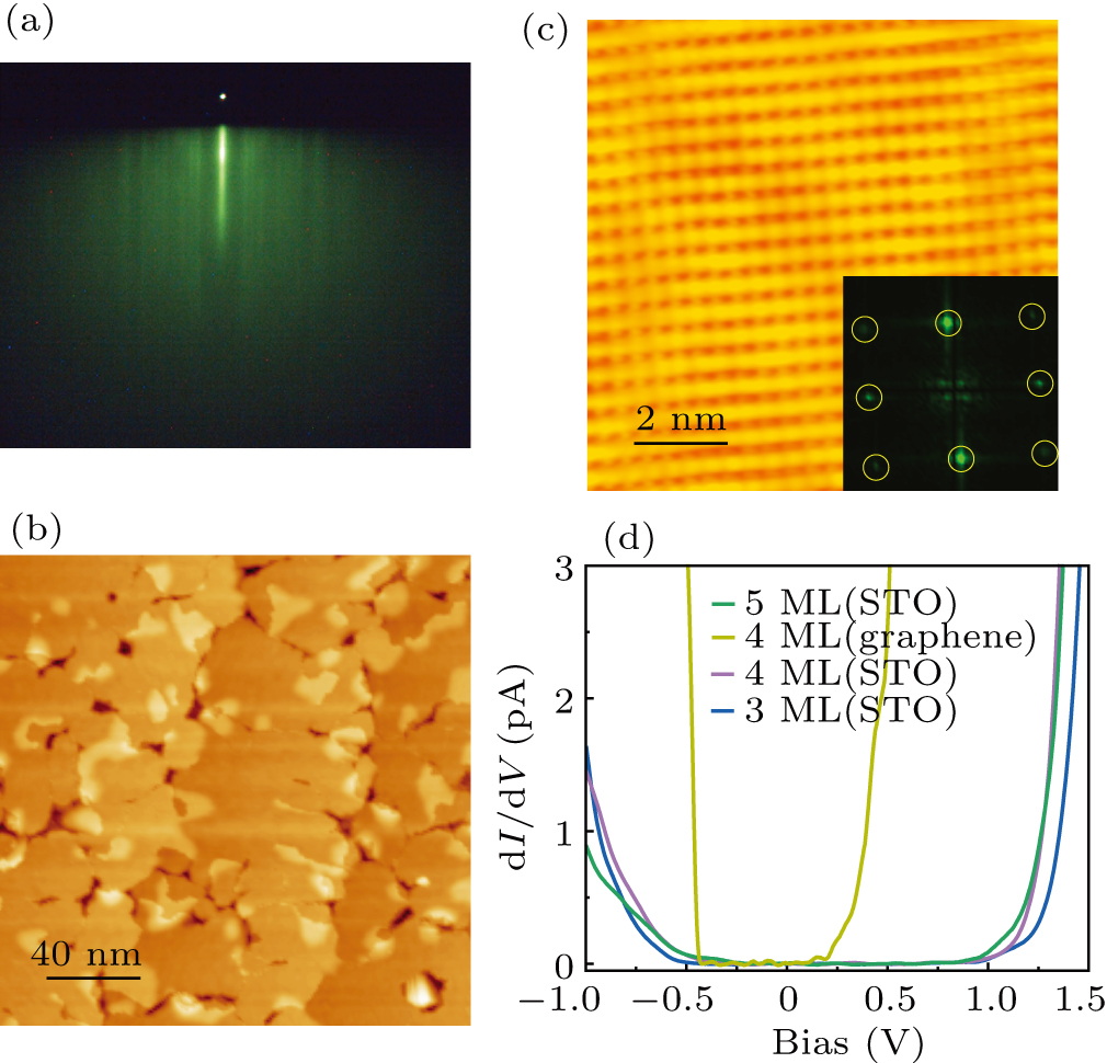 Our experiments were performed in a combined MBE (base pressure <2 × 10−10 Torr) and low-temperature scanning tunneling microscopy (STM) system (Unisoku 1300). The Nb-doped STO (001) (Nb:0.7 wt.%, Hefei KMT) were treated by the standard cleaning procedure including dipping in buffered oxide etchant (BOE, NH4F/HF 7:1) for 35 s.[25,26] In the MBE chamber, the substrates were first degassed and then annealed at 930 °C for 2.5 hours to get the (2 × 2) reconstruction. Ultra-high-purity tellurium (99.9999%) was evaporated from a standard Knudsen cell at a flux rate of ∼ 1 Å/min. After growth and recording the RHEED pattern, the sample was transferred into the STM system at 5.4 K. STS were acquired using a standard lock-in technique with a modulation voltage of 10 mV and at a frequency of 987.5 Hz at 5.4 K. The STM topographic images and spectra were processed with WSXM software.