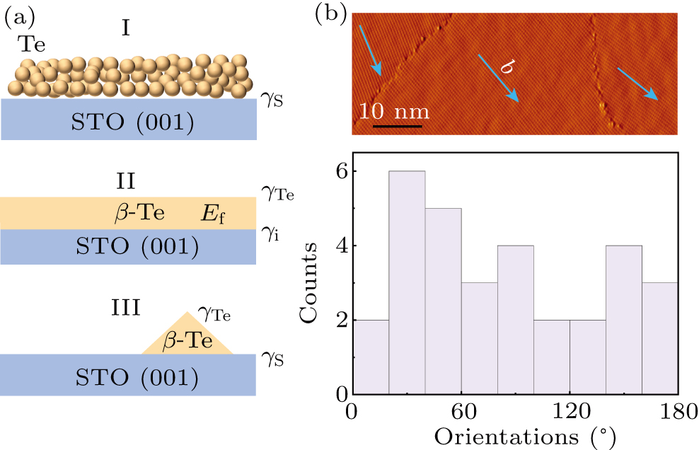 Above 7 ML, although the lower part (≤ 7 ML) of the film is flat and continuous, the additional Te atoms on the flat 7-ML film crystallize in a 3D manner (not shown), probably because of the enhanced diffusion of Te atoms on top of thick Te films. A more delicate annealing process is needed to keep the temperature below the diffusion temperature of Te atoms on thicker films and above the crystallization temperature. In addition, the orientations of domains in the Te-film seem random, without any preferred directions that register the in-plane lattice direction of the substrate. Figure 4(b) (upper one) shows the typical domain structures of the a-few-monolayer β-Te films on the STO (001) substrate by the LT/FA approach. Figure 4(b) (lower one) displays the statistics of orientations of the domains in Fig. 3(b), indicating the nearly random orientations of the Te domains. It is understandable because the substrate and the film have different lattice symmetries (the substrate is square while the β-Te film is rectangular). Furthermore, although the theoretically-proposed square phase matches better with the STO (001) substrate (1% mismatch), the as-grown films are always in the β phase (rectangular) probably because the square phase may only exist in some very special conditions.