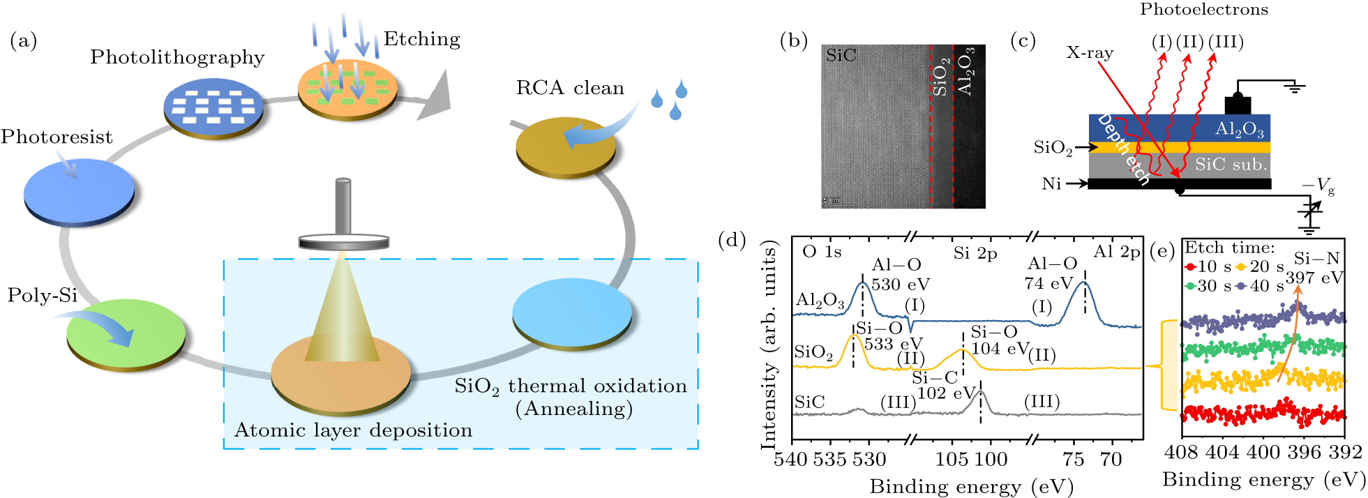 As seen in Fig. 1(b), a transmission electron microscopy (TEM) image of the prepared MOS stack showed that the Al2O3 and SiO2 were amorphous and the reaction at their interface was negligible. Note that the TEM contrasts of Al2O3 and SiO2 were at the same level. To understand the specific element distribution of the MOS capacity, the x-ray photoelectron spectroscopy (XPS) measurements were carried on the 35 nm thick Al2O3 stacked on nitride SiO2, as illustrated in Fig. 1(c). Figure 1(d) displays the photoelectron spectra of Al 2p, Si 2p, and O 1s, revealing the major components of the sample to be Al2O3, SiO2, and SiC. Notably, distinct bands corresponding to Al–O, Si–O, and Si–C are clearly visible. Additionally, we investigated the presence of nitride in the SiO2 films by varying the etching time from 10 s to 40 s and analyzing the N 1s position. A minor peak at 397 eV was observed near the SiO2–SiC interface, which can be attributed to the Si–N peak, providing evidence for nitride formation.[22] Based on these observations, we concluded that the 35 nm thick Al2O3 layer deposited on the nitride SiO2 substrate is well-constructed.