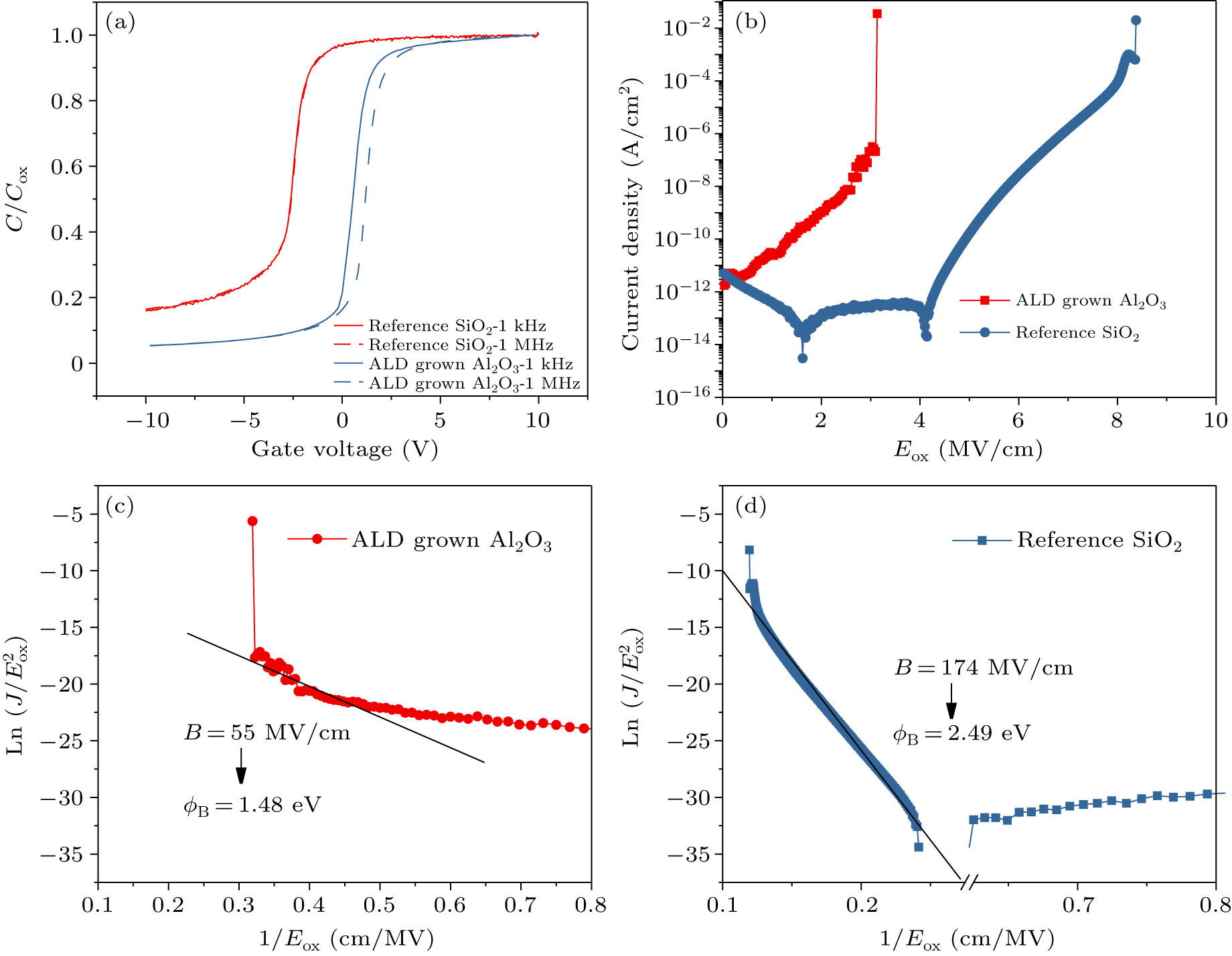 The MOS capacitors are investigated by I–V as well at room temperature. Leakage current density vs. electric field (J–E) curves for pure SiO2 and Al2O3 dielectric MOS capacitors are shown in Fig. 2(b). The thermal oxidated SiO2 has a breakdown field (∼9 MV/cm) which is higher than the ALD grown Al2O3 films (<4 MV/cm). This value of the breakdown field is below half the breakdown field achieved in the reference SiO2/SiC MOS capacitor. Besides, in that study, the leakage current density prior to breakdown is of the order of 10−7 A/cm2 which is a few orders of magnitudes higher than in the reference SiO2/SiC MOS capacitor, which could be the trigger for the degradation of the Al2O3 dielectric layer. Significant Fowler–Nordheim (F–N) tunneling is seen in the J–E profile of the sole ALD Al2O3 and reference SiO2 MOS sample. Therefore, the J–E response of these MOS samples is analyzed further using the F–N tunneling mechanism to determine the tunneling barrier height. F–N tunneling current density[23] across MOS devices at high field is described by