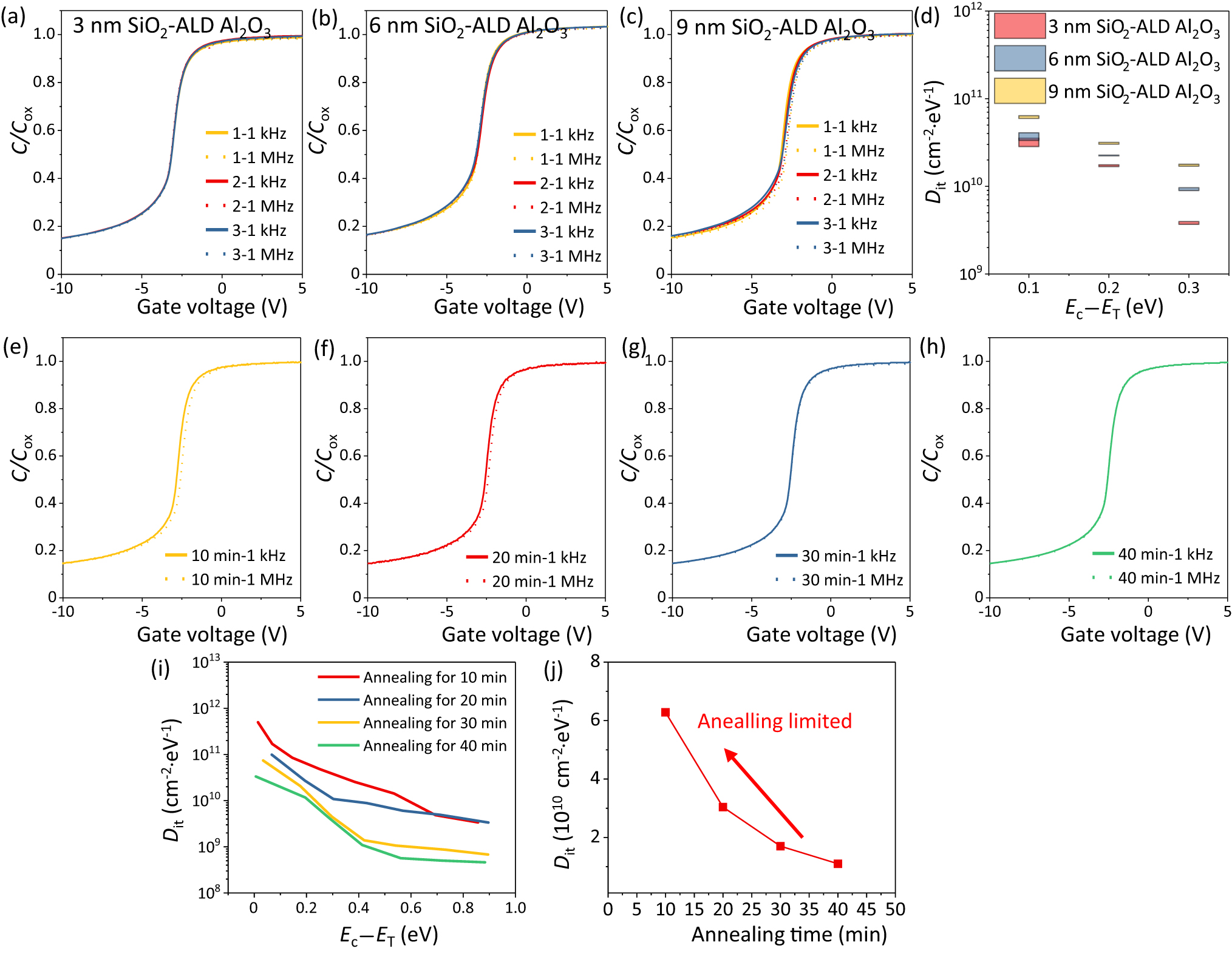 To better explain this phenomenon, we continue to do additional experiments to figure out the relationship between the annealing time and the density of interface state. As shown in Figs. 3(e)–3(h), we test the capacities of samples with increasing annealing time. Based on our experimental results as shown in Fig. 3(i), we have found that increasing the annealing time from 10 min to 40 min leads to a significant reduction in the density of interface states (Dit) at the SiO2–SiC interface. Specifically, we observed a decrease in Dit from approximately 6 × 1010 cm−2⋅eV−1 to 2 × 1010 cm−2⋅eV−1. These results reveal a clear relationship between annealing time and Dit, demonstrating that longer annealing times are necessary to fully passivate the SiO2–SiC interface as the thickness of the SiO2 layer increases, as shown in Fig. 3(j). Our findings provide strong evidence for the effectiveness of extended annealing times in reducing the density of interface states at the SiO2–SiC interface. We suggest that this effect arises from the thermal activation of oxygen species within the oxide layer, which helps to heal defects and improve the structural quality of the interface.