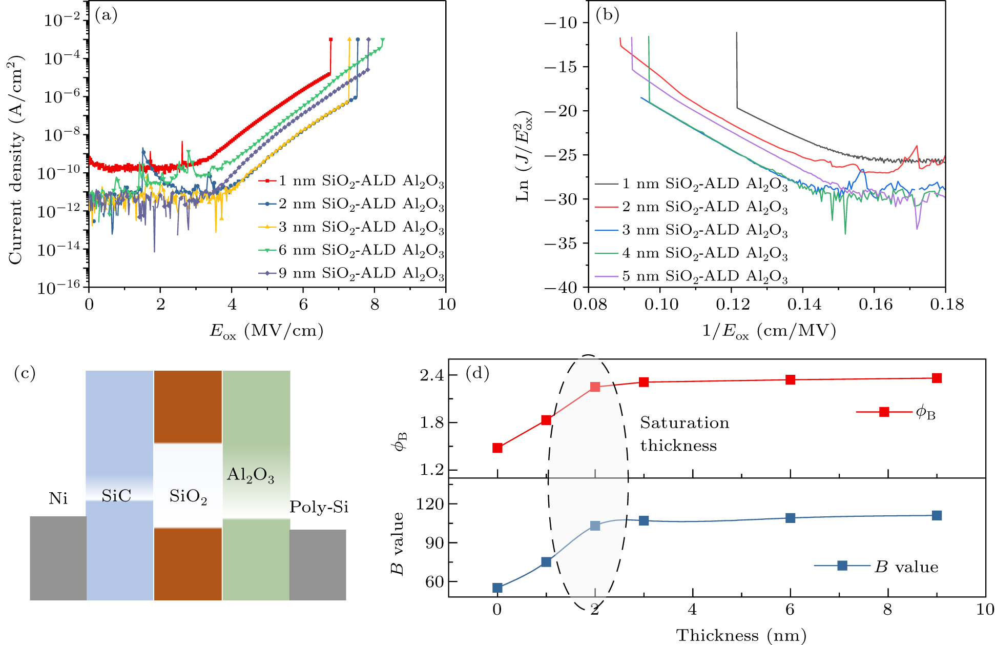 The impact of the inserted SiO2 on the interface barrier was also evaluated through the Fowler–Nordheim tunneling measurements. The F–N plots for Al2O3 stacked with different thicknesses of SiO2 samples were compared with both the ALD grown Al2O3 and the reference thermal oxidized SiO2, as shown in Fig. 4(b). The value of the parameter B was determined to be 75 MV/cm for a 35 nm thick Al2O3 stack on a 1 nm thick nitride SiO2, 103 MV/cm for 2 nm, 107 MV/cm for 3 nm, 109 MV/cm for 6 nm, and 111 MV/cm for 9 nm thick nitride SiO2. The effective barrier height, as determined by F–N tunneling, was extracted to be 1.83 eV for the 35 nm Al2O3 stack on 1 nm SiO2, 2.25 eV for 2 nm, 2.31 eV for 3 nm, 2.34 eV for 6 nm, and 2.36 eV for 9 nm thick nitride SiO2. For SiO2 thicknesses above 2 nm, the barrier heights of the Al2O3/SiO2/4H-SiC MOS samples were observed to be similar to those of dry SiO2 (< 10%), as determined through F–N tunneling, as shown in Fig. 4(c). The findings of the study suggested that beyond a thickness of approximately 2 nm, there is a saturation in the widening of the energy band offset between Al2O3 and SiC caused by the insertion of the SiO2 intercalation layer.