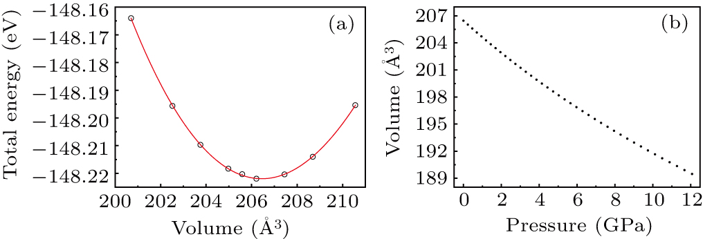 The cell with optimized structure is adopted for calculation, and the third-order Birch–Murnaghan equation of state is used to fit the energy–volume diagram of the LMO as shown in Fig. 1(a). According to the fitting results, the bulk modulus of LMO is 109.1 GPa and its first derivative is 4.9. At zero pressure, the equilibrium volume of the LMO is 206.46 Å3. The pressure–volume relation of LMO within 12 GPa is shown in Fig. 1(b). The prediction shows that at 12 GPa, the volume of LMO cell is about 189.5 Å3, and the volume is compressed by about 8%, indicating that LMO is sensitive to high pressure environment.