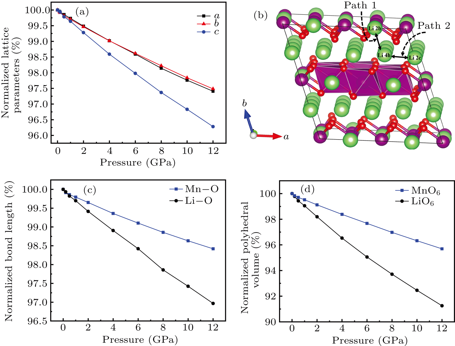• Figure 3(a) shows the variations of LMO cell parameters a, b, and c with pressures. The results show that the lattice parameters decrease with pressure increasing. At 12 GPa, lattice parameters are 4.862 Å, 8.410 Å, and 4.876 Å, respectively. After normalization, lattice parameters are reduced by 2.59%, 2.55%, and 3.72%. The compression rate of the cell is almost the same in the direction of [100] and [010], so it can be considered that the compression of the LMO in the direction of [100] and [010] are isotropic under high pressures. However, the compression ratio in the direction of [001] is significantly higher than the two pressures above: about 1.45 times the compression ratio in the direction of [010], which shows anisotropic compression. According to the LMO structure (Fig. 3(b)), the layered structure of LMO in the direction [001] leads to large compressible space between layers.