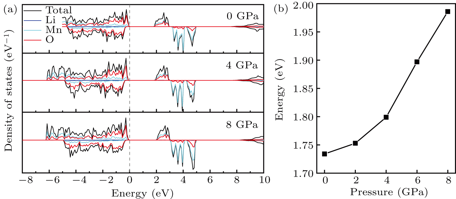 • Figure 4 shows the calculated electronic structures of LMO under different pressures. When the pressures are 0 GPa, 4 GPa, and 8 GPa, the band gaps are 1.734 eV, 1.799 eV, and 1.986 eV, respectively. When the pressure is 0 GPa, the calculated band gap is consistent with related research result,[38,39] and with the gradual increase of pressure, the band gap begins to expand. This means that it is harder for electrons in the occupied state to transition to the unoccupied state, and the electrical conductivity of the electrons will gradually decrease. This can regulate the electrical properties of the material.