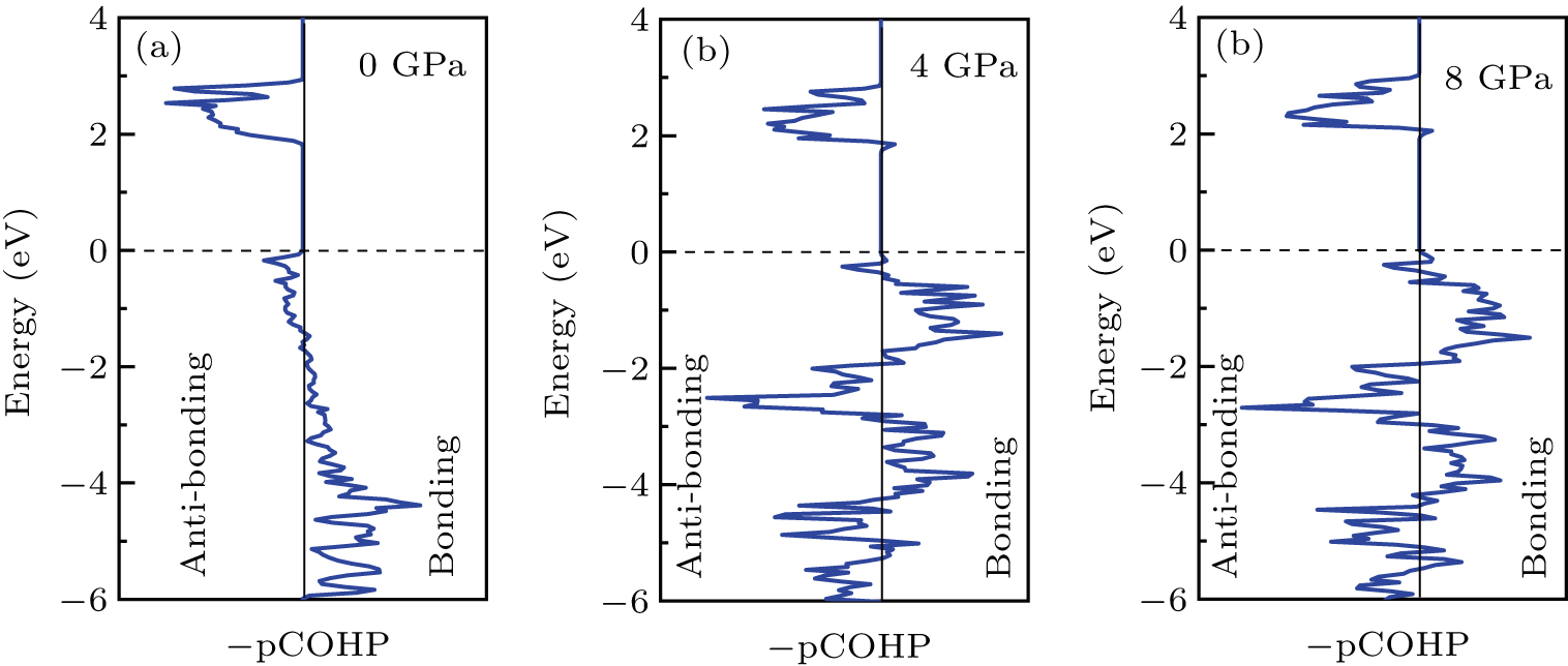 In order to better expound the influence of pressure on the stability of the cell in terms of electronic structure, we calculate the projected crystal orbital Hamilton populations (pCOHPs) of Mn and O atoms under different pressures, and the results are shown in Fig. 5. Figures 5(a)5(c) show the –pCOHP graphs of LMO under 0 GPa, 4 GPa, and 8 GPa, respectively. The integral of pCOHP (IpCOHP) is used to determine the influence of pressure on the stability of Mn–O bond. According to Fig. 5(a), it can be found that at 0 GPa, there are some anti-bonding components in a range from −1.8 eV to 0 eV, and below −1.8 eV, bonding components are the main components. At this time, the stability of Mn–O bond is mainly contributed by bonding electrons. However, at 4 GPa and 8 GPa, it can be seen from the –pCOHP diagram that there are a large number of anti-bonding electrons below the fermi level, which reduces the stability of Mn–O bond. This is also illustrated in IpCOHP. The IpCOHP values at 0 GPa, 4 GPa, and 8 GPa are −2.12, −0.73, and −0.57, respectively, showing a gradually increasing trend. Therefore, pressure can affect the stability of Mn–O chemical bond in LMO cells to a certain extent.