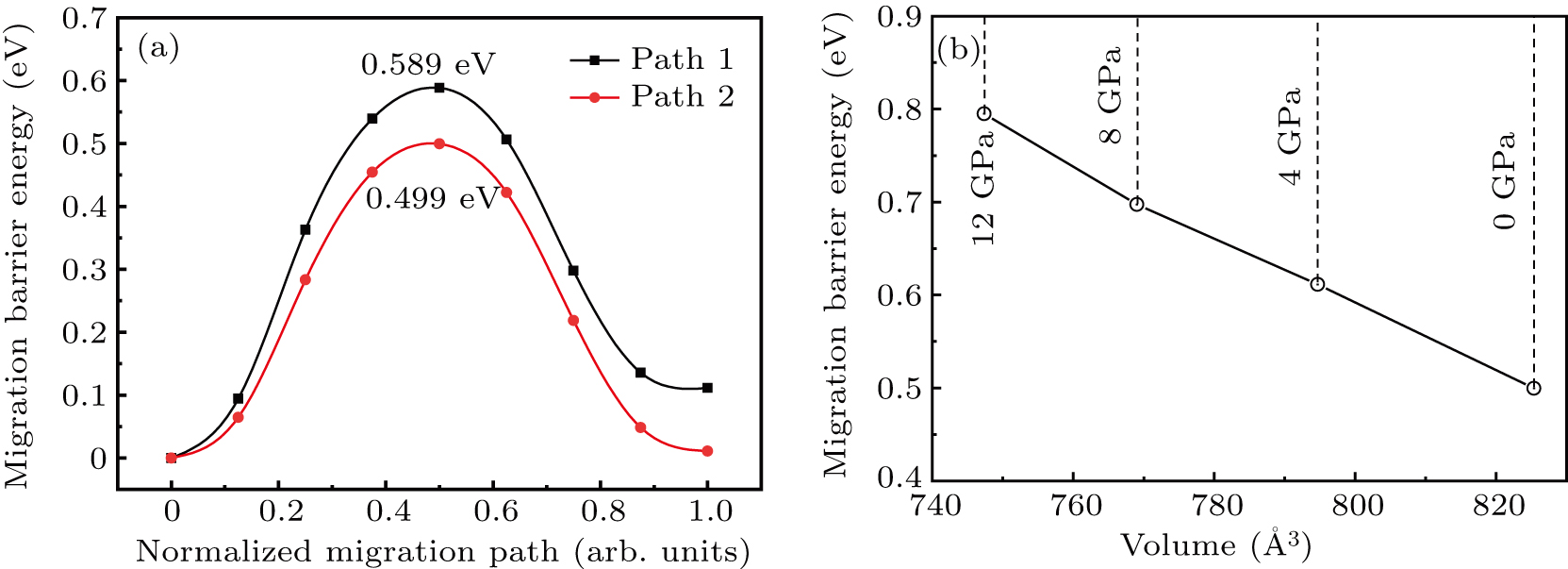• The CINEB method is used to calculate the migration path and migration energy barrier of Li+ in LMO under high-pressure compression,[40] and the ion migration paths are shown in Fig. 3(b), where path 1 represents the migration of Li+ at Wyckoff position 4h[41] in the lithium layers to site 2b in the transition metal layers, and path 2 represents the migration of Li+ at site 4h in the lithium layer to site 2c in the lithium layer. At 0 GPa, the migration energy barrier of path 1 and path 2 are 0.589 eV and 0.499 eV, respectively, as shown in Fig. 6(a). The calculation of the path 2 energy barrier is almost consistent with the related literature reports. The calculation results show that the Li+ migration energy barrier height of path 1 is about 0.09 eV higher than that of path 2. Figure 6(a) also shows that the energy of Li+ at site 2b is very higher than that at site 2c. This study indicates the huge difference in energy between the two paths from the perspective of energy, and Li+ in the lithium layer is more prone to delithium.