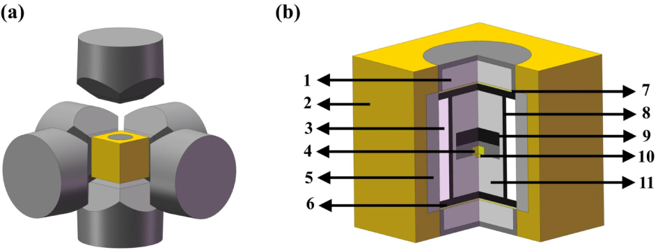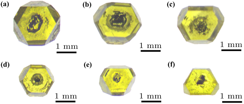 This study used a domestically produced large-capacity cubic high-pressure device (SPD-6 × 1200) to conduct high-pressure and high-temperature (HPHT) synthesis experiments on diamond crystals. The pressure range used was 5.8 GPa–6.8 GPa. The temperature range was 1600 K–1700 K. A schematic diagram of the HPHT equipment and the experimental device used for synthesizing diamonds is shown in Fig. 1. A {111} high-quality industrial grade diamond with a size of 1 mm was selected as the seed growth surface, along with high-purity flake graphite (purity of 99.99 wt.%) as the carbon source, Fe/Ni (80/20, mass ratio) as the catalyst solvent and Si powder (purity of 99.99 wt.%) as the additive. The high-purity graphite powder and Si powder were mixed evenly by weight in a mixer, and then pressed into a columnar carbon source for storage and backup. Variations in the quality and properties of the synthesized diamonds were investigated by regulating the pressure during synthesis. The pressure of the diamond synthesis experiment was calibrated using an oil pressure calibration curve established using the pressure inside the synthesis chamber and the high-pressure phase transition points of Bi, Tl and Ba. The temperature inside the chamber was estimated based on a relationship between input power and temperature measured by Pt 30% Rh/Pt 6% thermocouples. The measurement errors of both pressure and temperature in the synthesis system were each less than 1%.[6,26,27] At the end of the HPHT synthesis experiment, the samples were placed in a mixed solution of concentrated H2SO4 and concentrated HNO3 (3:1 by volume) and boiled, with the aim of removing metal catalysts and graphite impurities from the crystal surface. Before testing, the synthesized diamond sample was placed in anhydrous ethanol for ultrasonic cleaning to remove small adsorbents from the crystal surface. The crystal morphology was observed using optical and scanning electron microscopy, and crystal photographs were taken under the same exposure conditions. The crystal in this study mainly exhibited a {111} crystal plane, so a VERTE 70 V Fourier transform microscopic infrared (FTIR) spectrometer was used to measure the infrared spectrum on the {111} crystal plane. The spectral resolution was greater than 0.4 cm−1 and the data collection range was 800 cm−1–4000 cm−1. The Renishaw inVia Raman spectrometer was used to measure the Raman spectrum of the crystal’s {111} plane. The peak position error was controlled within 0.1 cm−1 and the spectral resolution was 1 cm−1.