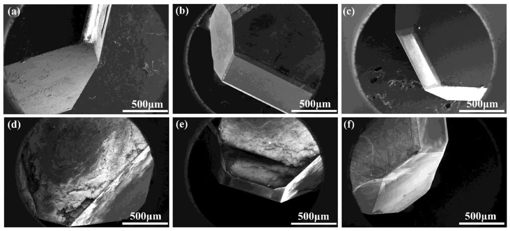In order to investigate the effect of pressure on the morphology of diamond growth, this experiment regulated the pressure used to synthesize diamond crystals and then analyzed and characterized the resulting crystals. Figure 2 presents an optical photo of a synthesized diamond from the Fe–Ni–C and the Fe–Ni–C–Si synthesis systems. Table 1 summarizes information such as pressure and temperature conditions and Si additive content in the carbon source and crystal. Figures 2(a)–2(f) correspond to samples D-1–D-6 in Table 1, respectively. The experimental results show that all crystals had hexagonal octahedra with {111} crystal planes. In both synthesis systems, increased pressure caused the color of the synthesized crystals to gradually become lighter. Free N atoms inside a type Ib diamond can affect the color of the crystal. When the color inside the crystal gradually changes from dark green to green, light green, yellow and light yellow, this indicates that the content of free N in the crystal has gradually decreased.[28] Estimated values of N content of the synthesized crystals are summarized in Table 1, and these results were also confirmed by subsequent FTIR characterization. In order to better observe and analyze the morphological characteristics of the synthesized diamond crystals under the different synthesis systems and pressures, scanning electron microscopy was used (Fig. 3). Under traditional HPHT diamond synthesis conditions (i.e., D-1), the diamond was not hindered or interfered with during the growth process. With the increase of pressure, the crystal surface gradually became complete and smooth, and high-quality crystals were synthesized. When Si powder was doped into the synthesis system (i.e., D-4), the crystal surface tended to be incomplete and the growth layer became rough. At the same time, a stepped morphology of the crystal surface was observed, with a large number of flaky defects appearing, but all these flaky defects were uniformly oriented in the same direction. This is due to a step-like growth trace left by the high-concentration doped diamond during the growth process, resulting in poor diamond crystal quality. The experiments show that when Si impurities are doped during the crystal synthesis process, Si and C in the lattice combine to form Si–C bonds, changing the length of C–C bonds and damaging the sp3 diamond structure. This will hinder the normal epitaxial growth of the crystal plane, causing defects such as step-growth layers to form on the {111} plane, changing the growth characteristics of the diamond crystals, and ultimately preventing the growth and development of intact diamonds. However, there are many factors that can lead to changes in crystal morphology and further research is needed to clarify their mechanisms. At the same time, it can be observed from the results presented here that when the pressure increased from 5.8 GPa (D-4) to 6.8 GPa (D-6), the growth texture and defects on the crystal surface were significantly reduced, the growth layer gradually became smooth and the surface roughness of the crystal was greatly reduced. Hence the experiments demonstrate that increasing pressure can have a positive effect on the quality of silicon-doped synthetic diamonds.