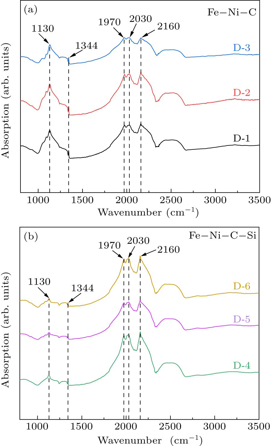 Infrared spectroscopy plays a crucial role in the identification and analysis of diamond crystals, effectively identifying the types of defects and impurity elements inside diamonds, such as N, H, B, etc. Infrared spectroscopy can determine the form and content of N present inside diamond crystal. In the infrared spectrum, 1970 cm−1, 2030 cm−1 and 2160 cm−1 are the characteristic peaks of diamond, representing the absorption peaks of the C–C bonds.[29] In addition, 1130 cm−1 and 1344 cm−1 correspond to the characteristic peaks of C-center N in the monophonon region,[30] and the peak absorption intensity represents the C-center N content in diamonds. In order to understand the effect of pressure on N content in crystals, this study obtained infrared absorption spectra of diamond samples at room temperature (Fig. 4). It can be seen that when the pressure was increased from 5.8 GPa to 6.8 GPa in the different synthesis systems, the absorption intensities of the 1130 cm−1 and 1344 cm−1 peaks tended to decrease. The following equations were used to describe the concentration of N impurities in the synthesized diamond crystals: where NC (ppm) represents the N concentration at the C-center inside a crystal and μ and A represent the correction coefficient and the absorption intensity, respectively.[31–33] The nitrogen concentration content of the diamond crystals synthesized under different synthesis systems was calculated using the above equations. The results are summarized in Table 1. In the Fe–Ni–C system, as the pressure increased from 5.8 GPa (D-1) to 6.8 GPa (D-3), the N content in the synthesized diamond decreased from 279 ppm to 241 ppm. In the Fe–Ni–C–Si system, the N content inside the silicon-doped diamond lattice decreased from 68 ppm (D-4) to 51 ppm (D-6). When the synthesis pressure increased, the N content in the diamond crystal decreased. Hence, the experimental results show that an increase in pressure can inhibit the entry of N into synthesized diamond crystal. Changes in pressure can have an impact on the performance of a catalyst in a synthesis system. Increasing pressure can increase the interaction between FeNi alloy and N atoms, thereby reducing the content of N atoms entering the lattice and directly affecting the N content inside diamond.[27,34] In addition, during HPHT experiments, doping is one of the methods that may be used to change the N content in diamonds. Si and N elements enter the diamond lattice together, forming Si–N bonds, resulting in a decrease in the N content of the lattice, and this was confirmed by the x-ray photoelectron spectroscopy (XPS) characterization. In summary, the influence of pressure on the N content of synthetic diamonds is caused by multiple factors and needs further exploration.