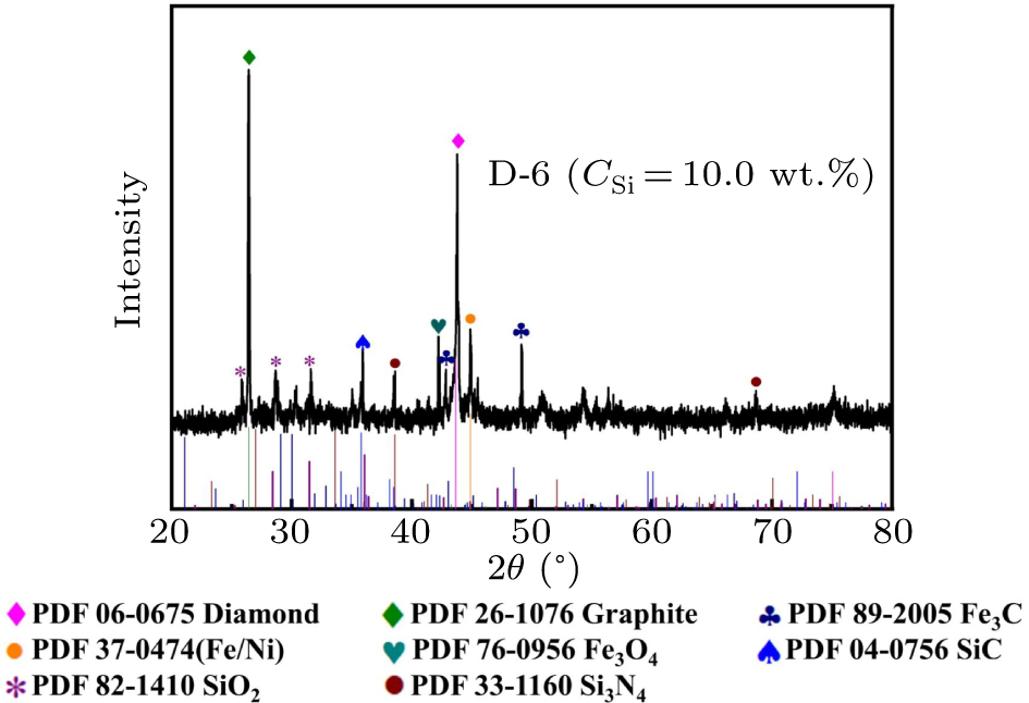 In this experiment, a typical synthesized carbon source block (D-6. 10.0 wt.% Si) was characterized using an x-ray diffractometer, and the phase composition characteristics of the Fe–Ni–C–Si system were obtained, as shown in Fig. 5. In addition to diamond, graphite, Fe/Ni alloys and iron carbide, which are common in the metal–C system, SiC (PDF 04-0756), SiO2 (PDF 82-1410) and Si3N4 (PDF 33-1160) are present in the carbon source block. The nitrogen content in the synthesized system is relatively certain, and there are two reasons why silicon doping reduces the nitrogen content of the diamond lattice. On the one hand, when the additive silicon reaches the low-temperature end of the crystal seed from the high-temperature end of the carbon source, the nitrogen atoms react with the Si in the molten Fe/Ni metal catalyst to form Si3N4, resulting in a decrease in the amount of nitrogen entering into the diamond. On the other hand, some of the nitrogen atoms enter into the diamond lattice in the form of bonding, and the bonding of N with Si leads to a decrease in the nitrogen content of the diamond lattice.