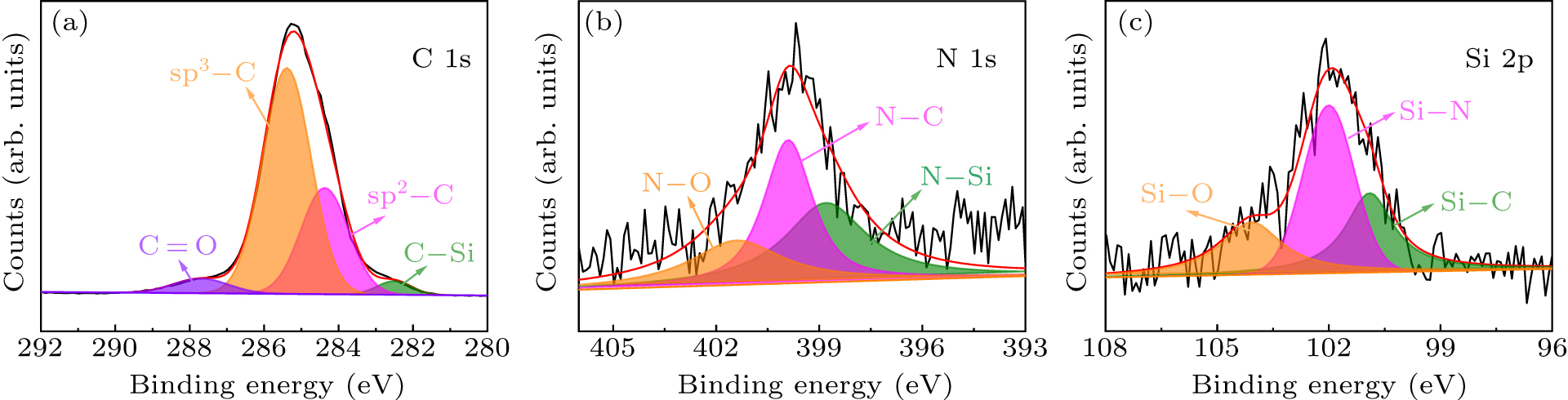 XPS can be used to characterize the chemical state, valence state, composition and relative content of atoms in diamond. This study used XPS to analyze the chemical states of C and Si atoms in experimentally synthesized diamond crystals. Figure 6 presents XPS spectra from the diamond crystal synthesized from a 10% Si source at 6.8 GPa pressure (D-6). After artificially crushing the sample, ultrasonic treatment was performed to remove impurities from the diamond surface and reduce experimental errors, and the analysis then aimed to characterize the crystal cross-section. Figures 6(a)–6(c) show the high-resolution XPS spectra of C 1s, N 1s and Si 2p, respectively. The four peaks obtained through peak-fitting in the high-resolution C 1s spectrum (Fig. 6(a)), correspond to sp3–C, sp2–C, C=O and C–Si bonds, respectively.[35] By fitting the resolution N 1s spectrum depicted in Fig. 5(b). the three peaks can be assigned to N–C, N–O and N–Si bonds (Fig. 6(b)).[36] The three peaks described in the high-resolution Si 2p spectrogram (Fig. 6(c)) correspond to Si–C, Si–N and Si–O bonds, respectively.[37] These results suggest that Si successfully entered the diamond lattice, and it can be seen that both Si and N atoms existed in the diamond. The bonding between Si and N in the lattice led to a decrease in N concentration.