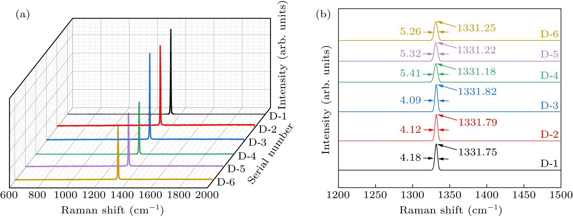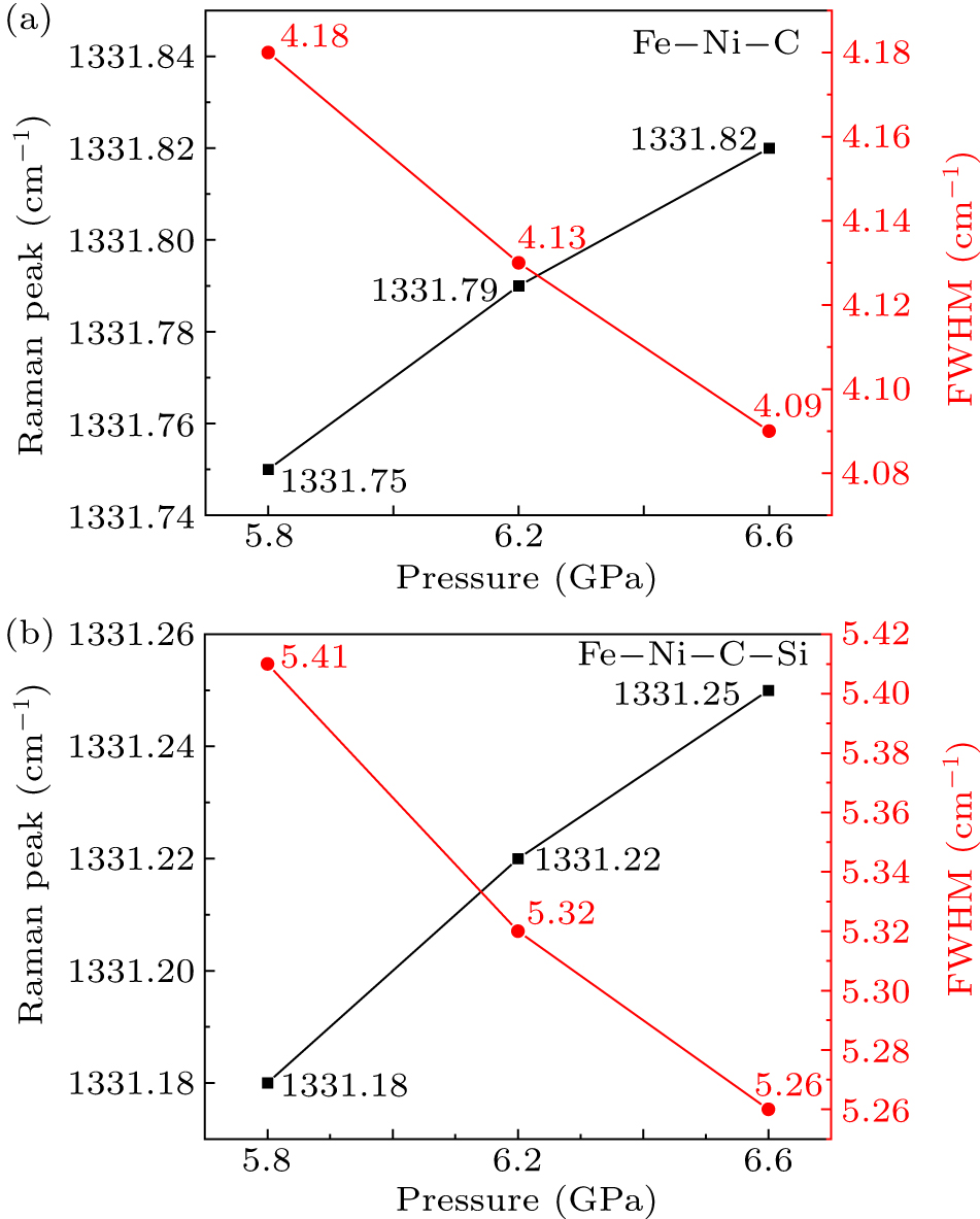 Raman spectroscopy can play a significant role in identifying C–C bond types in diamonds (such as graphite formed by sp2 hybridization and diamond formed by sp3 hybridization), as well as in natural diamond inclusions.[38] Raman spectroscopy curves can also reflect the internal structural changes of diamond crystals and distinguish the quality of diamond crystals. Raman spectroscopy has been widely used by researchers due to its non-destructive identification characteristics.[39] Figure 7(a) presents the Raman spectra of the diamonds synthesized under different synthesis systems and pressures, while figure 7(b) presents magnified images of the spectral data in the range of 1200.00 cm−1–1500.00 cm−1. The figure shows a strong and narrow characteristic peak in the Raman spectrum curve near 1332.00 cm−1. Diamonds synthesized in different systems have high-quality sp3 structures, without any sp2 structures related to graphite (1580.00 cm−1).[40] In order to better understand the shift of Raman peak positions, Gaussian fitting was performed on the data in this experiment. It was found that the Raman spectral peaks of Si-doped diamond crystals were straight without any excess peaks, but an increase in pressure would cause a slight shift in Raman peak positions. In order to observe the Raman peak position and halfwidth changes more clearly, figures 8(a) and 8(b) present the Raman peak position and halfwidth spectra of diamond crystals synthesized under different pressure conditions in the Fe–Ni–C (D-1–D-3) and Fe–Ni–C–Si (D-4–D-6) systems, respectively. When the FeNi catalytic system was not doped, the effect of pressure on crystal quality was not significant. In the Fe–Ni–C–Si system, as the synthesis pressure increased, the Raman spectrum peak shifted from 1331.18 cm−1 to 1331.25 cm−1, and the half-peak width decreased from 5.41 cm−1 to 5.26 cm−1. Increasing the pressure in the doping system will reduce the internal stress of the crystal and increase the crystallinity of the diamond crystal. This suggests that with the increase of pressure, the quality of synthesized diamond crystals improves. In order to calculate the surface residual stress of the diamond crystals synthesized in the Fe–Ni–C–Si system under different pressures, the following equation was used:[41] Here, the calculated positive stress corresponds to the residual tensile stress on the crystal surface as shown in Table 2. As the pressure in the Fe–Ni–C–Si system increased from 5.8 GPa to 6.8 GPa, the residual tensile stress on the crystal surface also decreased from 0.28 GPa to 0.26 GPa. The residual stress on the surface of synthesized diamond is also influenced by the synthesis conditions. As the pressure increased, the residual stress gradually decreased and the crystal quality gradually improved.