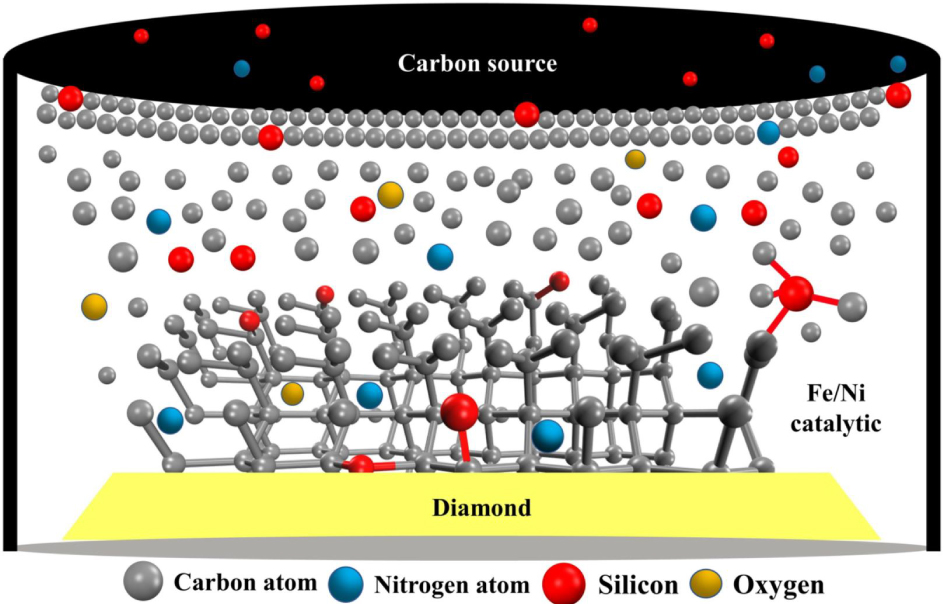 Exploring the impact of pressure on diamond growth changes provides a valuable reference for understanding the growth mechanisms of different types of natural diamonds and the composition of materials at different mantle depths. The experiments reported here were used to construct a conceptual picture of diamond growth in the Fe–Ni–C–Si system under HPHT conditions (Fig. 9). When the pressure and temperature in the synthesis chamber resulted in the minimum diamond growth conditions, the temperature at the carbon source was higher than that at the diamond seed. The concentration difference of the different elements between the carbon source and the crystal seed position brought about by the temperature difference was the driving force for forming the diamond and other related products. At this point, the metal catalyst in the molten state served as the reaction site and transport channel for different elements. In the synthesis system, driven by the temperature difference, carbon elements passed through the FeNi catalyst from the carbon source and reached the surface of the seed crystal. The solubility of carbon in the low-temperature region will have resulted in deposition on the surface of the seed crystal in the form of diamond. With time, the silicon-doped diamond increased in size. The elements such as N, Si and O in the synthesis system also arrived at the diamond surface in a similar diffusion transport manner and entered the diamond crystal in the form of C–N, C–O, C–Si and N–Si bonds. The bonding between Si and N in the lattice led to a decrease in the N content of the diamond. At the same time, as the experimental synthesis pressure increased, the interaction between the FeNi metal solvent and N increased, and the number of N atoms dissolved in the FeNi metal catalyst increased, resulting in a decrease in the N content of the lattice. This conclusion was confirmed by the FTIR results. In addition, the decrease in the half-peak width of the Raman spectra also suggests that the increase in synthesis pressure in the system improved the quality of the diamond crystals.