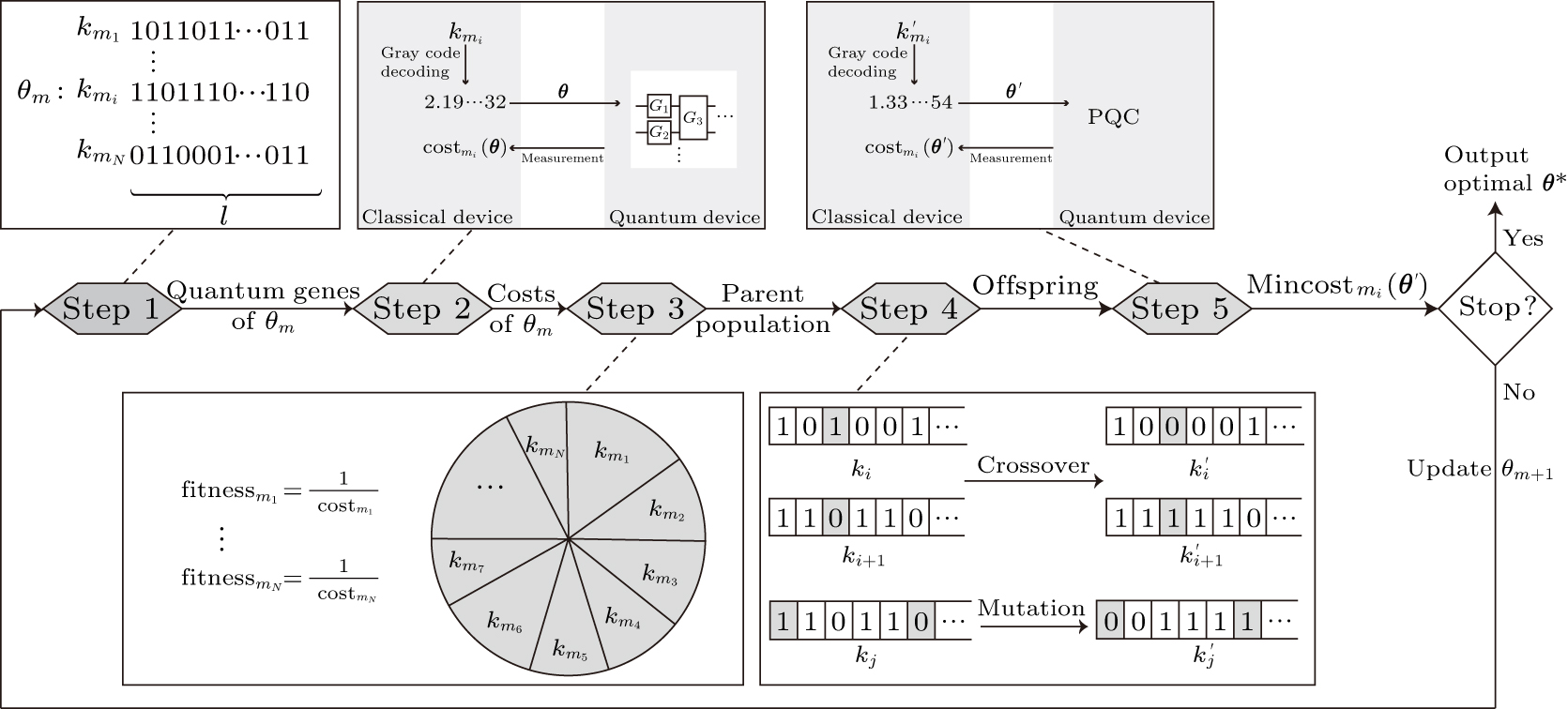 (5) Evaluation of offspring In step 5, all genes of the offspring are evaluated in the same PQC as step 2 to achieve cost values. Then the minimum cost value, denoted by min(costm(θ′)), is selected and checked to determine if it satisfies the stop condition. If the minimum cost satisfies the stop condition, the iteration is stopped, and the optimal parameter vector, represented as θ*, is outputted. If the minimum cost fails to satisfy the stop condition, the next component of θ, θm+1, is updated, and the optimization process is repeated.