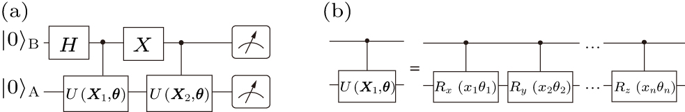 To compare the performance of the proposed GCO algorithm, Bayesian optimization (BO) algorithm,[21] binary code based optimization (BCO) algorithm,[23] and an adam-based optimization method, are simulated simultaneously. In this work, the BCO algorithm is almost identical to the GCO algorithm, with the only difference that BCO uses regular binary conversion when decoding from binary to decimal while GCO utilizes Gray code decoding. Gradient-based parameter optimization is the mainstream optimization approach in machine learning. In this simulation, the results of adam-based method are used as a benchmark, facilitating the understanding of the strengths and limitations of the proposed GCO algorithms. The simulations were realized by the PennyLane[25] module in Python. In the training processes, the number of gene bits for the parameters is 10. The probabilities of crossover and mutation are 0.3 and 0.05, respectively. There are 30 circles of all parameters that are trained at one time during the training process for GCO, BO and BCO, 15 circles for the adam-based method. The classification tasks of Iris are achieved in the environment without noise, and the tasks in MNIST are achieved in the environment with four typical quantum noise,[26] i.e., bit flip, depolarizing, phase flip, and amplitude damping, under a probability of 5%. In Pennylane, noises are modeled as unitary operation and introduced into the PQC. The PQC we use[27] for the quantum classifier is shown in the Fig. 2, two registers are contained in the PQC, A and B, which are used to store the training data and corresponding labels, respectively. During the training process, the training data of two datasets X1, X2 and parameters θ are input into the register A, while the labels are input into the register B. The training objective is to ensure that the quantum state of register A forms the same as of register B, that is, U(X1,θ*)|0〉A = |0〉A and U(X2,θ*)|0〉A = |1〉A, thus the PQC trains data of two datasets simultaneously by creating a unique mapping between the training data and the labels. After training, the final state of the PQC is |00〉AB+|11〉AB. The quantum gate CU(Xi,θ) is composed of multiple controlled-phase gates, and each controlled-phase gate contains one component of the training data and parameter vectors. As a result, the depth of the PQC is dependent on the dimensionality of the training data vector.