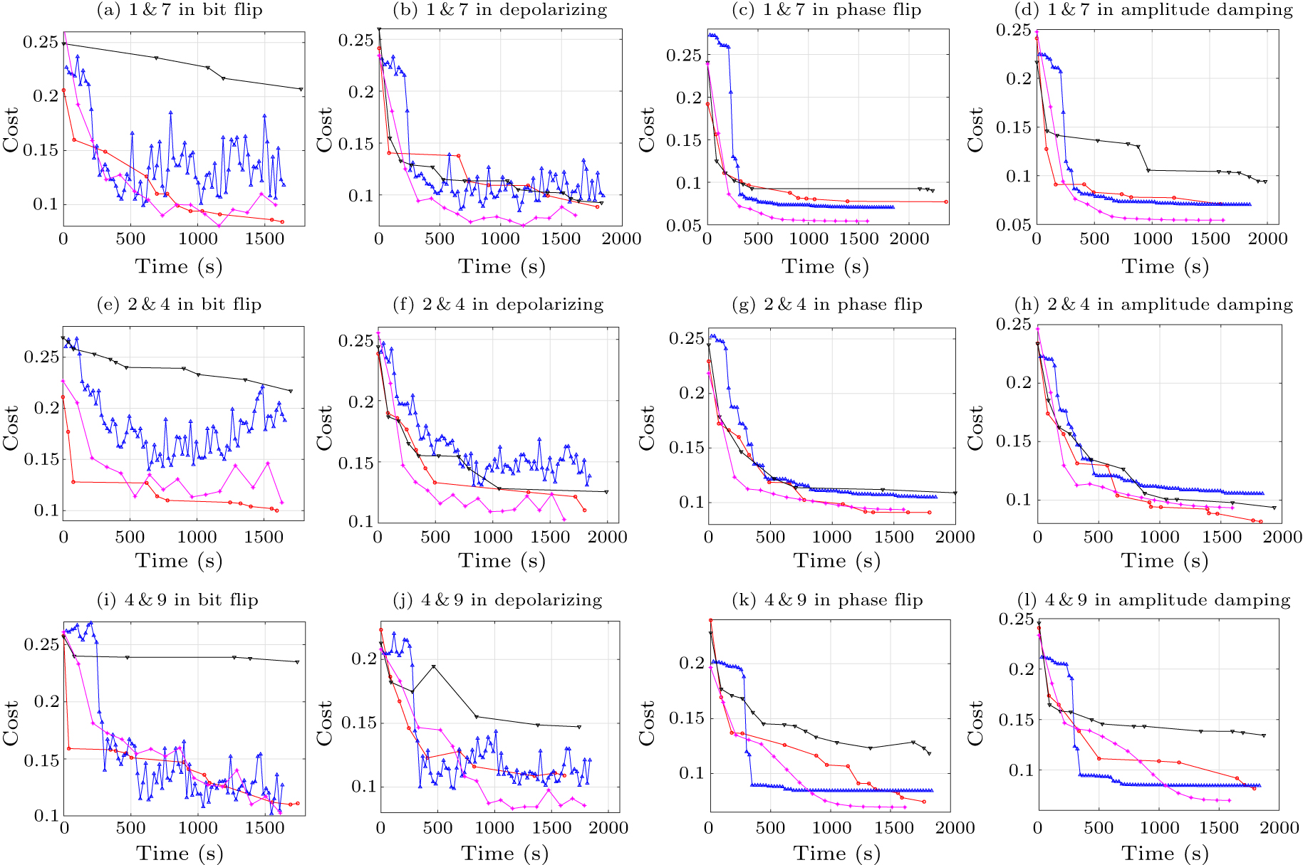 The results of the proposed GCO, BO, BCO and adam-based algorithms for the three classification tasks 1&7, 2&4, and 4&9, are evaluated in terms of cost value against time in Fig. 3. In comparison to the BO, BCO and adam-based algorithms, the GCO algorithm maintains the ability for continuous convergence during the training process for four types of noise. It hints that the GCO algorithm is robust and has some resistance to the noisy environment. While the BO algorithm only has good robustness against phase flip and amplitude damping noises, the BCO algorithm exhibits both lower convergence capability and poorer robustness compared to the BO and GCO algorithms. The adam-based optimization method fluctuates in bit flip and depolarizing noises and shows good performances in phase flip and amplitude damping noises. However, overall, the adam-based method consistently converges, indicating robustness to four types of noises.