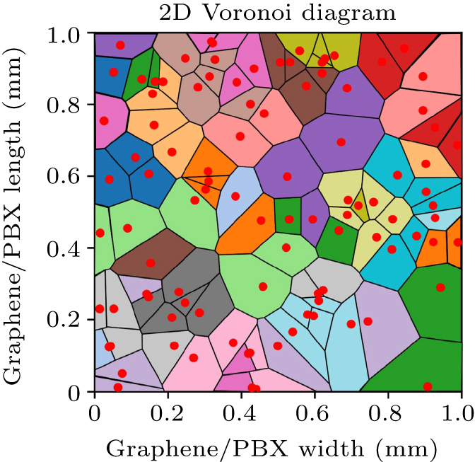 We initially construct diverse configurations of graphene fillers dispersed within a polymer matrix, each with a distinct spatial distribution. The detailed procedure starts by designating the geometric centre points of the graphene fillers as sampling points. Subsequently, we designated the geometric centre points of the graphene fillers as sampling points and employed a point-by-point insertion technique to generate a two-dimensional (2D) Voronoi diagram within the matrix boundary of 1 mm×1 mm, incorporating 100 graphene fillers. This method[27] facilitates the creation of a Voronoi tessellation, or Thiessen polygon, which serves to partition the entire spatial area under investigation. Consequently, this approach enables us to measure the level of aggregation of the graphene fillers throughout the matrix.