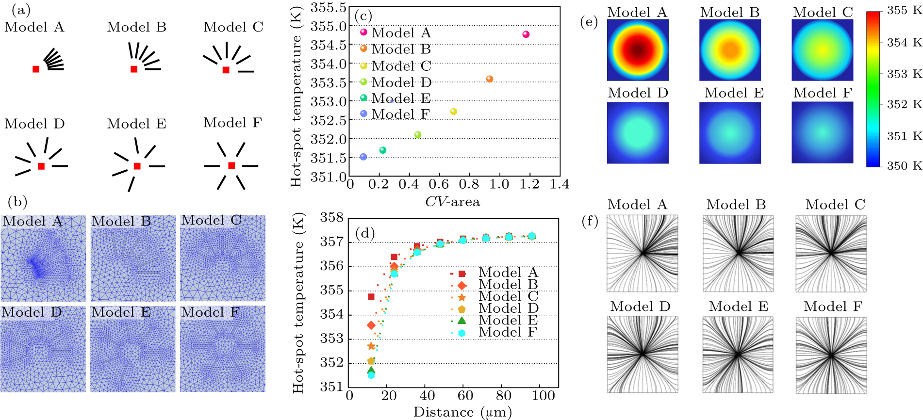 Figure 2(a) illustrates six models with different spatial configurations of graphene in the composites (model A to model F), in which the geometric center of the graphene fillers maintains a constant distance of 12 μm from the heat source. The angular separation between the fillers in the models increases in increments of 10°, starting from 10° in model A and ending at 60° in model F. The dimensions of the models are 1 mm×1 mm, encompassing a central heat source measuring 7.37 μm×7.37 μm, with the graphene fillers arranged in a concentric configuration, each with fixed dimensions of 1 μm×10 μm. The heat source is positioned at the center of the model, with a heat flux density of 200 W/m2. The thickness of the model is 0.34 nm. Triangular meshes (shown in Fig. 2(b)) were generated for the models, with typical dimensions ranging from 12 nm to 70 μm.