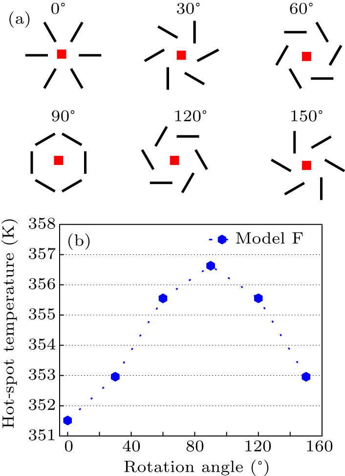 We conducted a detailed investigation into the impact of graphene filler orientation on the temperature at the hotspot. As depicted in Fig. 3(a), we developed six distinct models, each with a unique orientation of graphene fillers, by rotating the initial configuration (model F) by a defined angle. Figure 3(b) illustrates that the initial configuration (model F) exhibits the most effective heat dissipation properties in relation to the hotspot. With an increase in the rotation angle, the temperature at the hotspot also increases, culminating in a peak at 90°. Beyond this point, further increments in the rotation angle lead to a decrease in temperature, attributed to the symmetrical nature of the models.