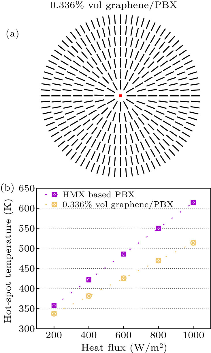 As depicted in Fig. 4(a), graphene fillers measuring 1 μm×10 μm are symmetrically distributed around a central heat source, which is 7.63 μm×7.63 μm. The multi-layered arrangement is meticulously designed to ensure uniform and efficient heat transfer from the centre outwards. The innermost graphene layer is positioned 12 μm from the heat source, with the angle between fillers calculated by dividing 360° by the number of fillers. For instance, the innermost layer has 12 fillers, each separated by an angle of 30°. In each subsequent layer, the distance from the heat source increases by 12 μm, maintaining the same angular arrangement for consistent symmetry and distribution. This configuration forms a mesh-like diffusion pattern, enhancing heat dissipation across the material matrix. The graphene fillers account for a volume fraction of 0.336%, and their geometric arrangement is optimized to maximize thermal conductivity in the HMX-based PBX composite material. As shown in Fig. 4(b), the central hotspot temperature varies with the applied heat flux density, revealing a linear relationship between temperature and the applied heat flux. In the case of graphene-filled PBX, the maximum temperature reduction of 100 K occurs when the heat flux density reaches 1000 W/m2.