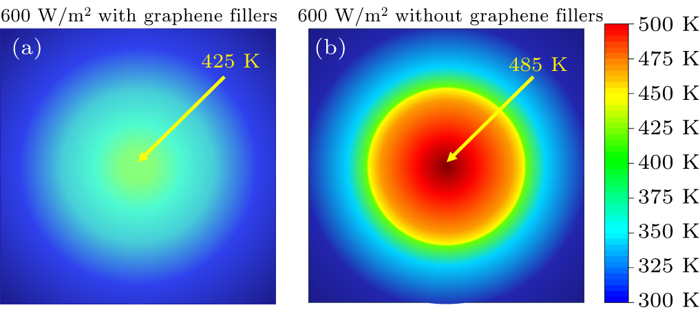 To better understand the mechanisms behind these phenomena, the temperature distribution of graphene-filled PBX was plotted and compared with systems without graphene fillers, as shown in Fig. 5. In the graphene-filled PBX model, due to the high in-plane thermal conductivity of graphene, heat can propagate along the graphene planes from the central heat source (Fig. 5(a)). In contrast, in the model without graphene-filled PBX, heat is confined around the central heat source (Fig. 5(b)). This demonstrates that the graphene heat fillers provide additional pathways for heat propagation, contributing to the reduction of hot-spot temperature. The model, through precise geometric design, enables the graphene fillers to be uniformly distributed within the PBX matrix, optimizing the overall thermal conductivity of the material. This layered and uniformly distributed configuration allows the model to minimize the accumulation of heat in any particular region, ensuring that heat is evenly distributed throughout the composite matrix. This design strategy offers a method to maximize thermal transport optimization while maintaining the material’s thermal properties and a low filler ratio.