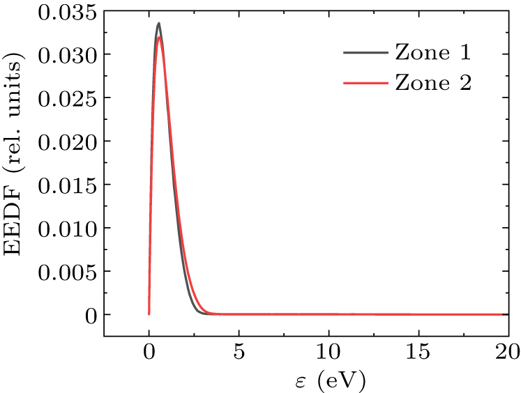 Figure 10 shows the electron energy distribution functions in zone 1 and zone 2 (see Fig. 1(a)) within the anode channel (with very few high-energy electrons), giving the effective temperatures of electrons in zone 1 and zone 2, Teff–1 = 0.59 eV and Teff–2 = 0.65 eV, respectively. Te and Teff are in good agreement. The presence of very few high-energy electrons and some moderate-velocity electrons (see Subsection 3.3) in the channel result in a small deviation between Te and Teff. As the zone moves closer to the outlet, these electrons are depleted, and then electrons approach thermal equilibrium. Consequently, Teff–1 is closer to Te than Teff–2.