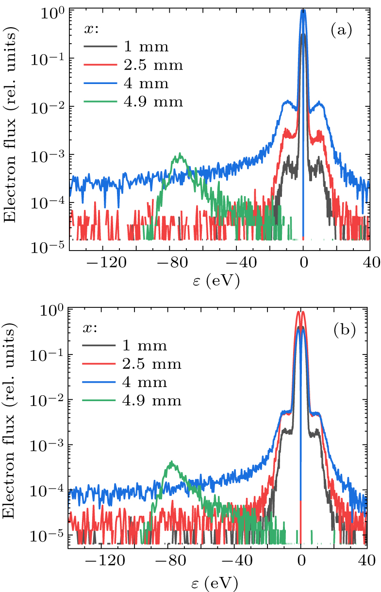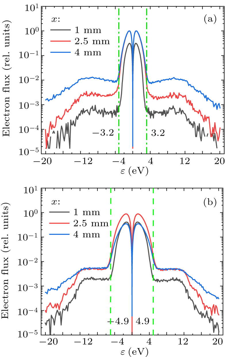 • Figure 11 illustrates the dependence of electron flux on total kinetic energy for four x-direction positions. The positions x = 1 mm and x = 3.5 mm represent the long and short anode outlet, respectively, x = 2.5 mm is inside the long anode channel but outside the short anode channel, x = 4 mm is at the anode inlet, and x = 4.9 mm is near the cathode. Referring to data on the interaction of electrons with argon atoms, the threshold energy for collisions that cause energy loss is approximately 12 eV.[37] Based on the potential well energy (approximately 5 eV), electrons are categorized into high-energy electrons — comprising fast electrons (> 12 eV) and moderate-velocity electrons (5 eV–12 eV) — and low-energy electrons (slow electrons, < 5 eV) in this paper. It is evident that the flux distribution in both the long and short anodes deviates from the Maxwellian distribution, and the trends at corresponding positions are similar (Figure 12 more clearly shows the part below 20 eV). Low-energy electrons are generated through the continuous ionization of argon atoms by fast electrons and are confined within the anode channel by the potential well and x-direction electric field. They dominate at all positions except at x = 4.9 mm. As electron energy increases, the electron flux decreases s significantly. Within the energy range of approximately 5 eV–12 eV, the flux distribution exhibits a plateau, where the flux remains nearly constant. Initially, the electron flux decreases with increasing energy; however, at this specific range, it undergoes a sudden change. This distinct feature in the flux distribution is referred to as the enhanced high-energy tail. When the energy exceeds approximately 12 eV, a portion of the electrons undergo excitation and ionization reactions with argon atoms, leading to energy loss and the generation of low-energy electrons, while others are directly absorbed by the anode. These two processes together gradually deplete the high-energy electron population. The flux distribution at x = 4.9 mm differs significantly from that at other positions, with electrons almost exclusively moving toward the outlet and 80-eV electrons predominating. At x = 4.9 mm, the electric potential is −320 V (Fig. 7). Theoretically, electrons emitted from the cathode should have gained 80 eV of energy by the time they reach this position. However, the actual electron energy ranges from 20 eV to 90 eV. Before reaching this position, most electrons lose energy in collisions, resulting in energies below 80 eV. The authors in Ref. [38] statesd that some electrons emitted from the cathode surface already possess energy. A few of these electrons may reach this position without colliding, thus retaining energies greater than 80 eV. The dominant 80-eV electrons are those emitted from the cathode surface without initial energy. This fraction of electrons has a mean free path greater than 0.1 mm, does not undergo collisions, and reaches the position without energy loss. This subset of electrons is referred to as ‘beam-like’ electrons in this paper.