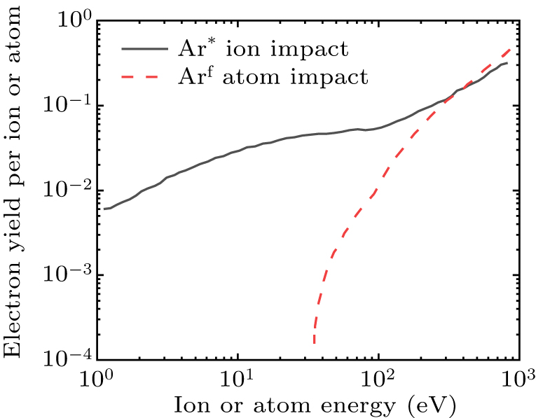 In glow discharge experiments, free electrons provide the initial conditions for the discharge.[33,34] Similarly, in numerical simulations, an initial distribution of plasma must be established in the spatial domain at the starting time to initiate the discharge process. The initial plasma density setting only affects the time required for the discharge to stabilize. Our simulations set uniformly distributed initial plasma (ne = 1.0 × 1017 m−3) as the initial condition to activate the discharge, allowing it to reach a stable state more quickly. The ions between the electrodes move toward the cathode under the attraction of the electric field and hit the surface of the cathode, generating secondary electrons. The secondary electrons are accelerated by the electric field and collide with the argon atoms to produce electron–ion pairs after gaining sufficient energy. The electric field repels the electrons and moves downstream of the discharge. The ions repeat the above process, and finally, the discharge is stabilized. The secondary electrons are essential to maintain the discharge. The true secondary emission generated by the electron bombardment of the electrode’s surface was turned off, and only the emission of secondary electrons emitted by the cathode surface that completely absorbs the bombarded ions was considered. Based on the potential difference between the electrodes, the ions achieve a maximum energy of 400 eV upon striking the cathode surface. Figure 2 gives the data of secondary electron emission coefficient of Ar ion striking on copper metal surface.[35] The emission coefficient is set to 0.21. The Monte Carlo collision part of the code involves elastic collisions, ionization reactions, and excitation reactions between electrons and argon atoms, and elastic collisions and charge exchange between ions and argon atoms.