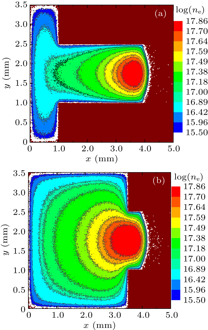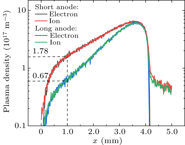A comparison of the plasma density variation in the x-direction of the long and short anode channels is plotted in Fig. 4. Between the cathode and anode, the plasma density profile for the short and long anodes almost coincides. The ion temperature is set to 0.025 eV in the simulations, while the electron temperature is much higher than the ions. Electrons, having considerably higher thermal speeds than ions, move quickly toward the wall and are absorbed, resulting in charge separation in the electrode gap. The sheath is formed when the electron flow and ion flux balance and its thickness closely approximates to the electrode spacing. The electric field in the sheath repels electrons and attracts ions to the cathode, leaving the ion density much larger than the electron density in the sheath. The electron and ion densities in the anode channel are nearly equal, maintaining plasma quasi-neutrality. In this coordinate system, the logarithmic density decreases linearly toward the left boundary, with a sharper decline in the long anode. At x = 1.0 mm, the density in the short anode is approximately three times higher than at the outlet of the long anode. Additionally, the density at the short anode’s outlet (x = 3.5 mm) exceeds that of the long anode’s outlet. As the anode length increases, more plasma is absorbed, leading to a progressive density reduction towards the left boundary in the long anode. These findings demonstrate that shortening the anode effectively increases plasma density at the outlet while reducing plasma consumption within the anode channel.