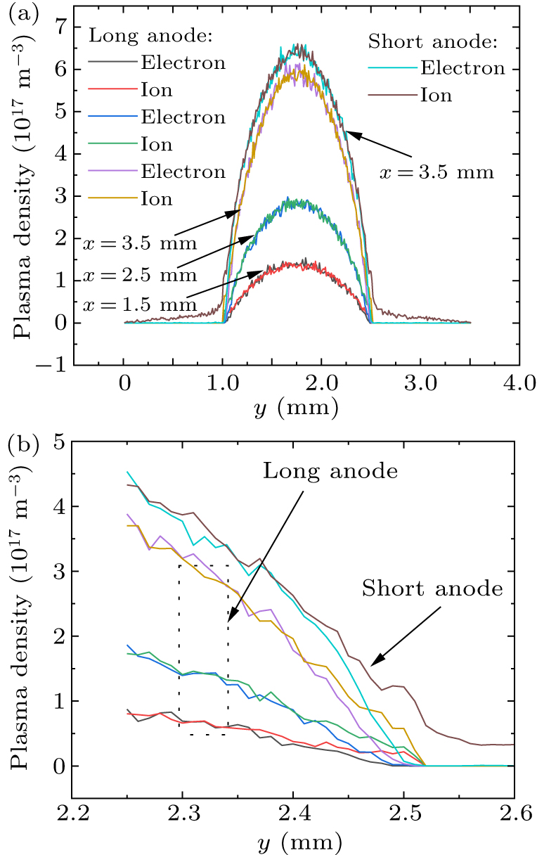 Figure 5 compares the y-direction variation of plasma density inside the anode channels. Positions x = 1.5 mm, 2.5 mm, and 3.5 mm are located inside the long anode channel, whereas only x = 3.5 mm is within the short anode. Figure 5 shows that at x = 3.5 mm, the plasma density in the short anode channel is slightly higher than in the long anode, a distinction not easily observed in Fig. 4. As the position approaches the outlet, the plasma density in the long anode channel gradually decreases. At the outlet, the plasma density in the short anode channel is at least six times that of the long anode. In the y-direction, the plasma density exhibits a parabolic distribution. In Fig. 5(b), near y = 1.0 mm and y = 2.5 mm, the ion density near the anode wall surpasses the electron density, indicating charge separation and the formation of an anode sheath. The charge separation is more pronounced on the short anode wall in Fig. 5(b), making the net charge significantly larger suggesting a greater potential difference in the sheath. The maximum plasma density occurs at y = 1.75 mm, primarily due to particle absorption by the anode, which results in lower density near the walls and higher density in the channel center. Additionally, the electric field in the sheath repels electrons, causing them to accumulate in the middle of the channel. This repulsive effect is stronger in the short anode due to its greater sheath potential difference, leading to a higher density at x = 3.5 mm. This demonstrates the collimating effect of the hollow anode structure on electrons. Elsewhere in the channel, electron and ion densities are nearly equal, maintaining quasi-neutral plasma.