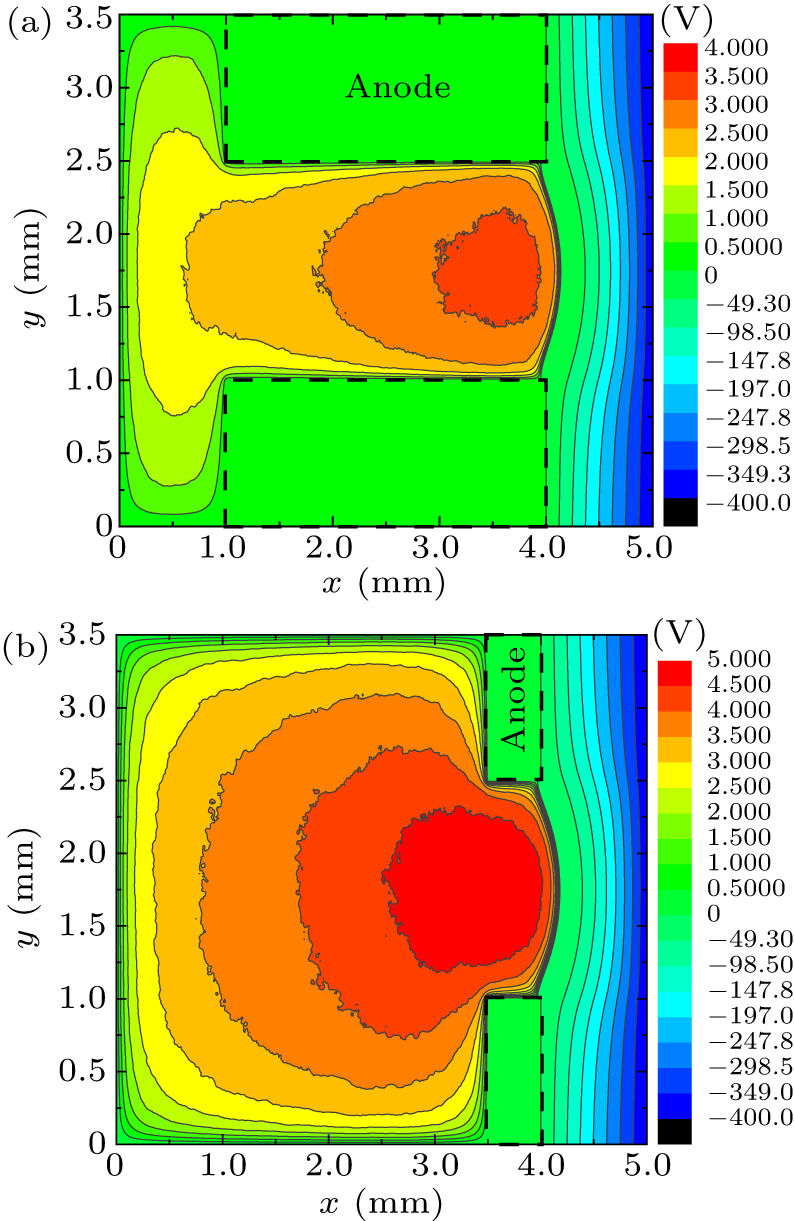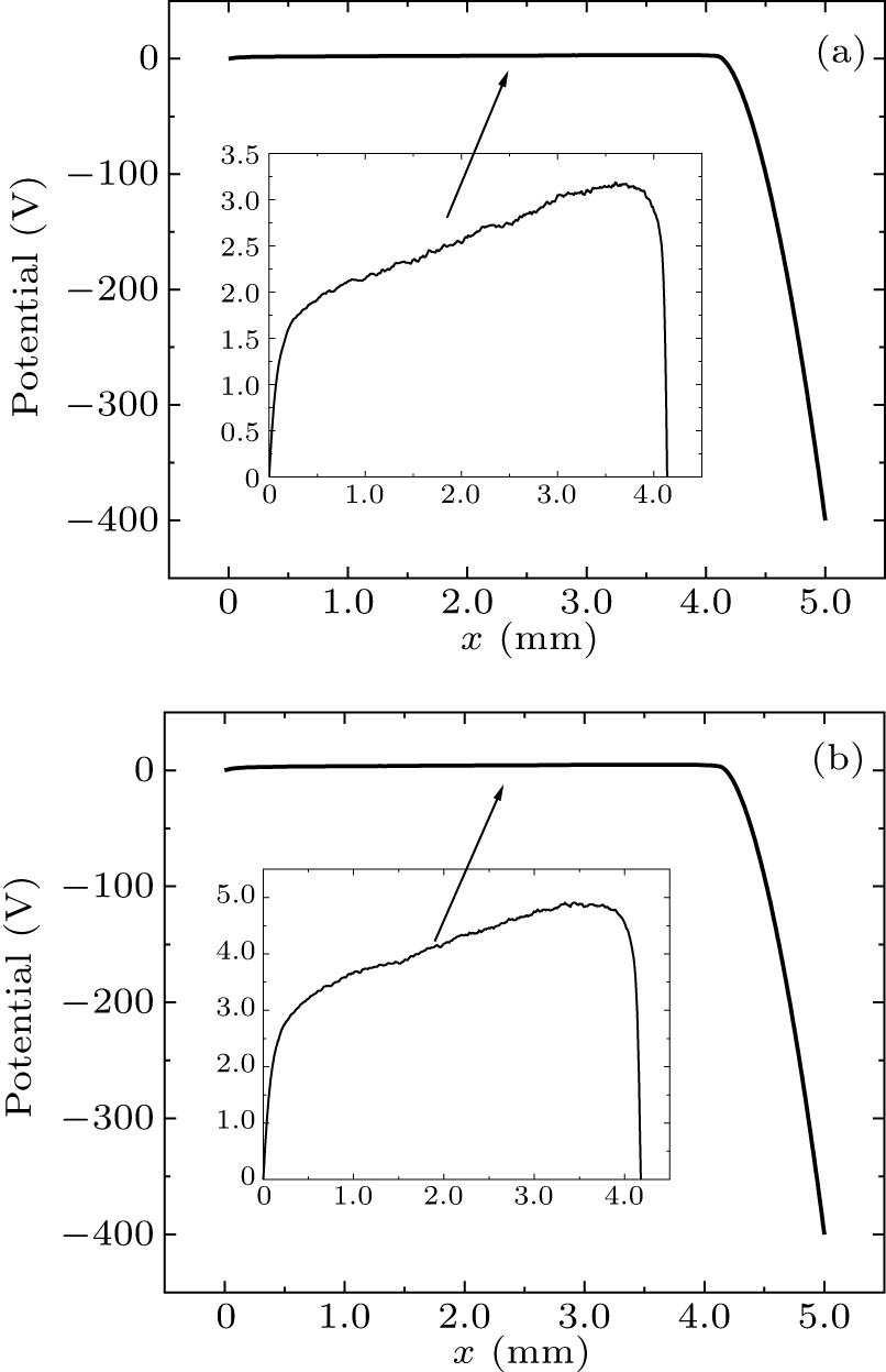 The schematics of the potential variations versus the x-direction position are shown in Fig. 7. Secondary electrons are accelerated by the sheath electric field, transferring energy from the electric field to the electrons, resulting in a 400-V potential drop across the sheath of the electrode gap, equal to the applied voltage. The potential inside the channel decreases almost linearly along the outlet direction, while the potential outside the outlet decreases towards the boundary direction to 0 V. The inlet of the long and short anode channels exhibits potential peaks of 3.2 V and 4.9 V, respectively. The corresponding potential differences relative to the potential at x = 1 mm are 1.2 V and 0.8 V. The electric field is directed from the anode outlet towards the inlet. These results indicate that shortening the anode increases the potential peak within the channel.