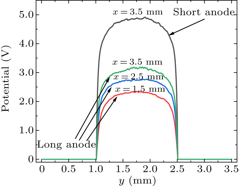 Figure 8 shows the comparison of y-direction potential variations inside the anode channels, providing further evidence that shortening the anode increases the potential peak in the channel. At x = 3.5 mm, the potential peak in the short anode channel is significantly higher than that in the long anode channel. The potential is symmetrically distributed in the y-direction, with the peak appearing at the center of the channel and rapidly decreasing toward the anode wall. The potential peak in the channel, combined with the grounded anode, forms a potential well in the xdirection, where the electric field points from inside the well toward the anode wall. This field exerts an force on electrons, guiding them toward the center of the channel. Since the potential well in the short anode has a higher energy, it exerts a stronger force on electrons.