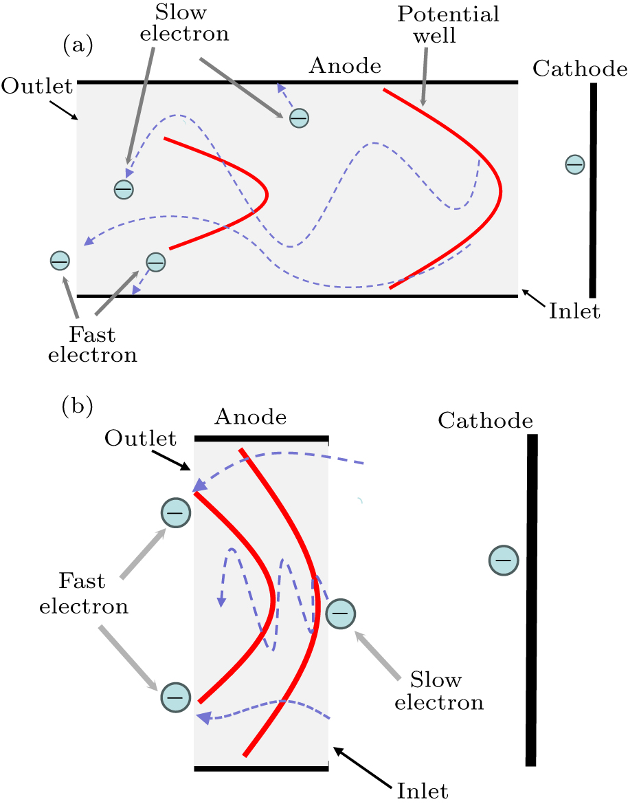 Figure 9 shows the possible trajectories of electrons inside the anode channel. While the potential well attracts electrons toward the inside of the channel, its effect varies depending on electron energy. Low-energy electrons with energies lower than the potential well are mostly confined within the y-direction of the channel, accumulating inside. Only those near the wall are directly absorbed. High-energy electrons with energies exceeding the potential well either undergo collisions: losing energy and becoming low-energy electrons, or escape the well and are absorbed by the walls. A small fraction of high-energy electrons, which do not undergo collisions, are influenced by the electric field of the potential well and are redirected toward the channel, eventually exiting through the outlet. Different anode lengths create potential wells of varying energy, affecting electrons across different energy ranges. This analysis of electron motion further elucidates the collimating effect of the hollow anode structure.